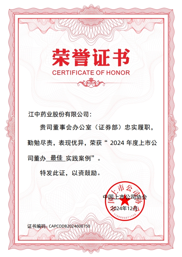 上述荣誉的获得体现了中上协对江中药业在规范运作、信息披露、投资者关系管理、ESG管理等方面工作的高度肯定。