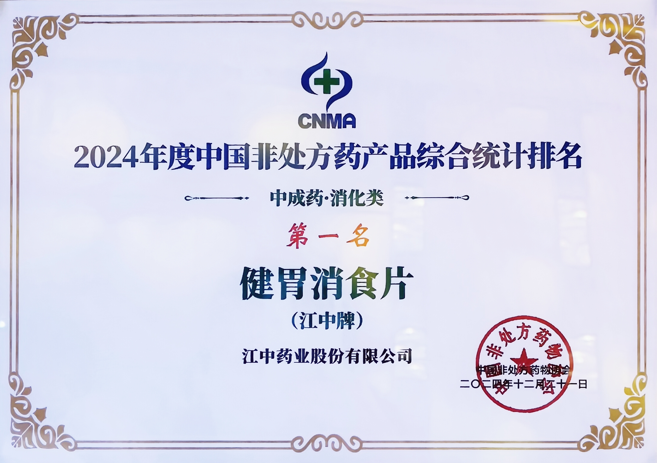 近日,由中国非处方药协会主办的“第二届OTC品牌大会”在北京召开。会上公布了“2024年度中国非处方药生产企业综合排名”,江中药业股份有限公司荣登第14位。同时,“2024年度中国非处方药产品综合统计排名”中,江中牌健胃消食片荣获中成药消化类第一名,以及“中国非处方药黄金大单品”称号。