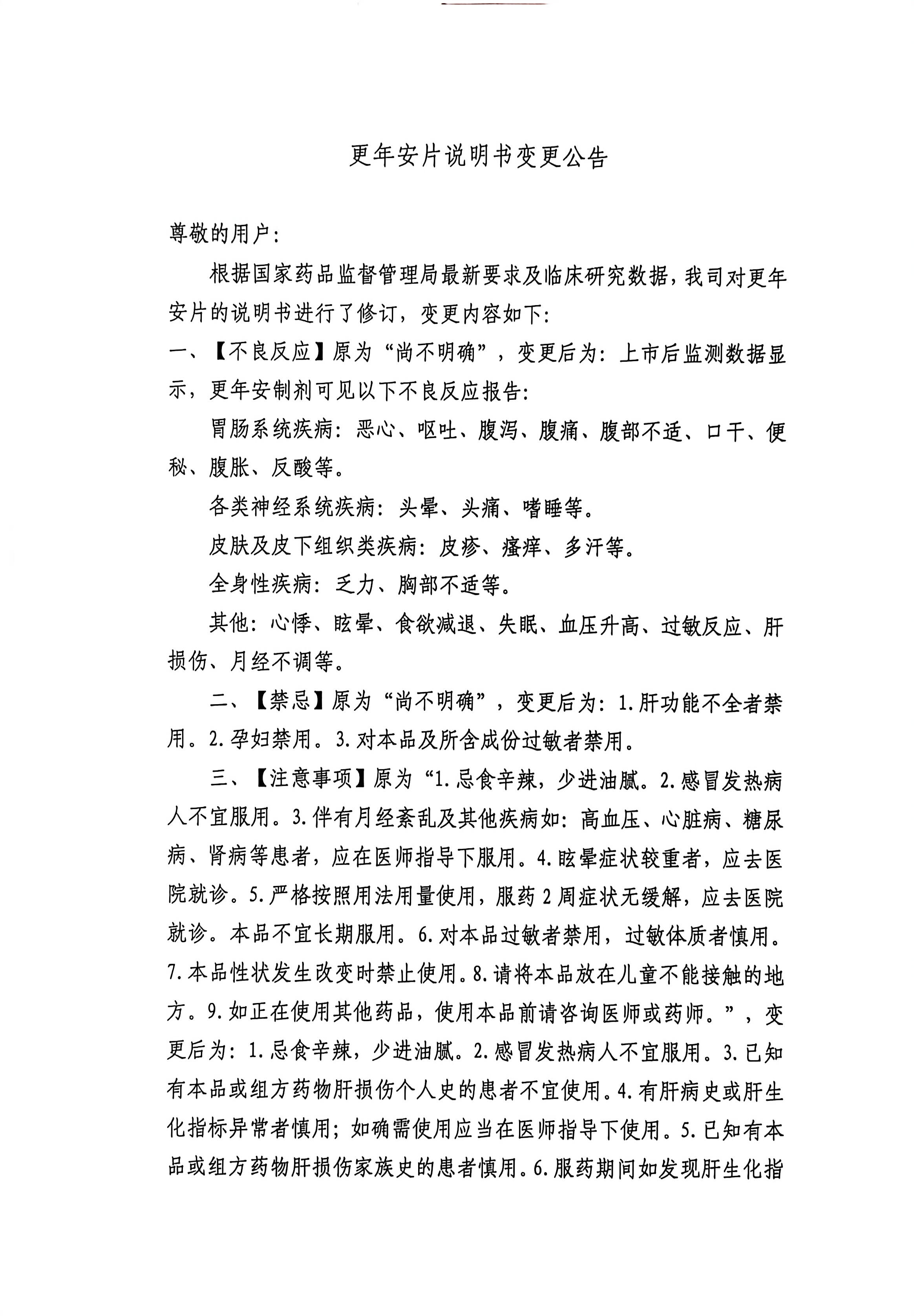 更年安片说明书变更公告
